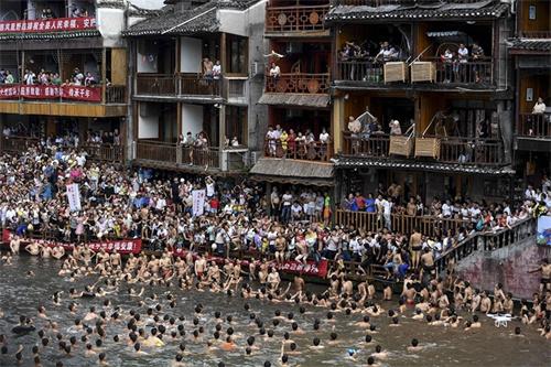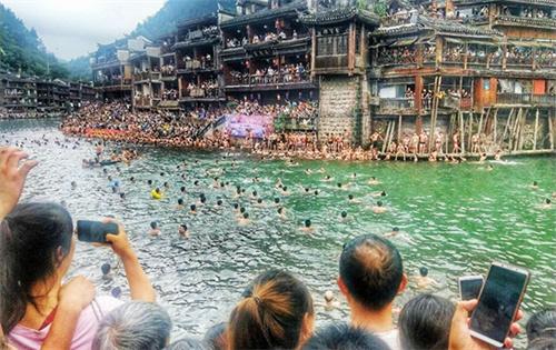 參與搶鴨子的選手們最后為了抓到鴨子,紛紛選擇跳入水中去進行抓壓,而這一舉動也直接將活動推向到了高潮的一刻,選手們大膽的跳入河中之后和其他選手進行了一場非常激烈的爭奪之戰。讓在旁邊圍觀的觀眾都無比的羨慕,而活動在這個時候,氣氛更是已經到達了一個極其熱烈的時刻,這個活動也將湘西鳳凰古城獨具特色的民俗習慣淋漓盡致的給呈現了出來,也讓更多游客了解到了湘西的民俗。