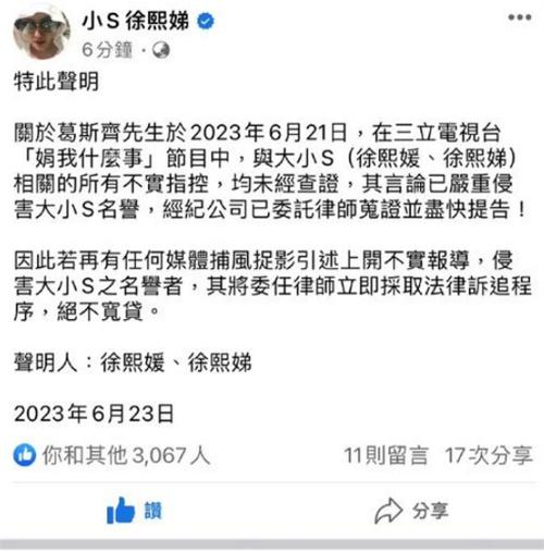 葛斯齊在節目中對外進行過爆料之后,大s和小s一方立即發布了聲明,稱葛斯齊在節目中對兩位藝人的指控均屬不實,而且已經嚴重侵犯了大s和小s的名譽,后續也將會公開對他進行訴訟,看到大s所發布的聲明之后。葛斯齊也給出了回應,稱他表示自己非常的難過,難過的主因并不是因為自己成為被告,而是自己表示對當地人民已經失望了。