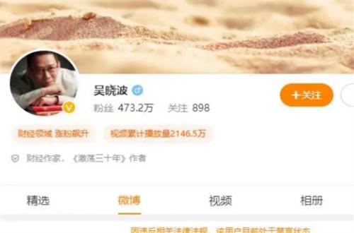 吳曉波創立了自媒體“吳曉波頻道”,藍獅子財經叢書也成為了中國本土財經書籍出版的著名品牌之一。早在2022年的6月份吳曉波的微博賬號就被微博禁言,當時顯示的也是違反相關法律法規,就在去年6月份吳曉波微博賬號被封禁的同時,吳曉波經營的“吳曉波頻道”微信公眾號也停更了數日,顯示停更的原因依然是被禁言。