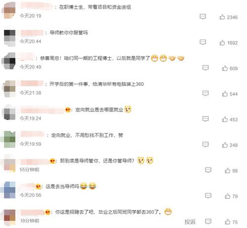 網友們在看到周鴻祎發布的這條微博消息之后,紛紛調侃稱,周鴻祎這是帶著自己的項目以及資金進組了啊,有些網友則戲稱,去上學的時候如果你的導師管你,你會服從導師的管理嗎?在大學開學之后,你首先要做的事情就是魏清華的電腦全部都給裝上360,感覺你這不是去上學改而是去招聘了,畢業之后你的同班同學很有可能也會進入到360工作。