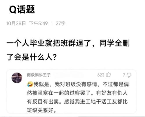 近日,浙江杭州一位畢業的女大學生在社交媒體上面爆料稱,她將90%的同學,老師和好友都刪除以后,遭到部分人的辱罵和添加。他自己表示和這些人以后的交集幾乎為零,保留他們的關系毫無意義,因此來決定刪除,然而他事后發現一些被刪除的同學竟然是在辱罵他,甚至有人在好友驗證留言當中對他進行侮辱,這個事件曝光也立即引發了熱議,對于是否刪除不常聯系同學的這個話題,網友們也表示了不同的觀點。有網友認為刪除同學并不是必要的,可以選擇屏蔽他們的動態或者消息,畢竟他們曾經是同班同學,有一些共同的記憶,而另一些人認為一些無效化的社交是可以去避免的。