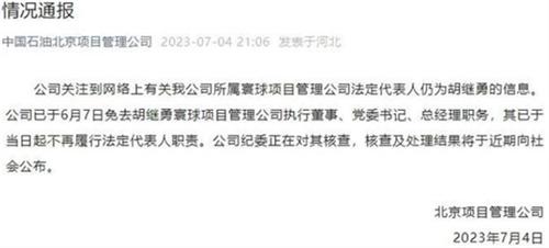 北京時間7月4日,中國石油北京項目管理分公司對該起事件也再一次發布了,官方通報在通報中顯示,公司在6月7日已經解除了胡繼勇執行董事總經理黨委書記這些職務。同時于6月7日起,胡繼勇也將不再為北京寰宇項目管理公司的法定代表人,目前公司紀委對這一結果也正在調查核實,具體的處理結果調查清楚之后,會在近期向外界進行公布。