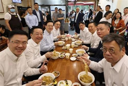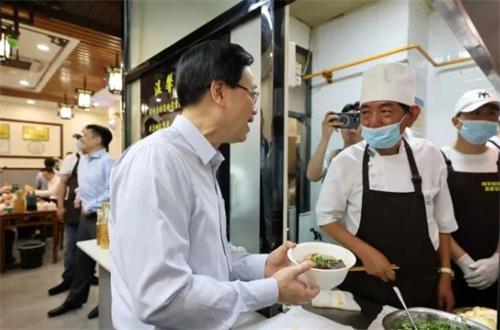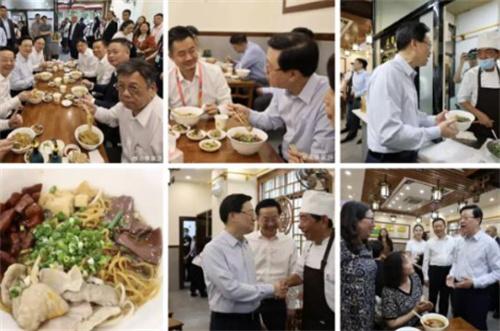7月6號(hào)上午李家超一行人來到貴陽市云巖區(qū)一家老字號(hào),品嘗當(dāng)?shù)氐奶厣〕阅c旺面,期間李家超還邀請(qǐng)貴州小伙伴一起到香港去體驗(yàn)當(dāng)?shù)氐拿朗场?/strong>北京時(shí)間7月5號(hào)下午香港特別行政區(qū)行政長(zhǎng)官李家超率領(lǐng)訪問團(tuán)到貴州訪問。品嘗完特色小吃之后李家超就在自己的個(gè)人微博賬號(hào)中點(diǎn)贊了貴州風(fēng)味的早餐,腸旺面是是常旺的諧音寓意非常的吉祥,正好能夠比喻泛珠九省區(qū)和港澳特區(qū)多方合作帶來的長(zhǎng)旺、常旺、暢旺。