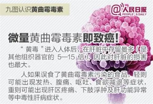 黃曲霉菌向來被世界衛生組織劃定為一類致癌物,這種物質其實在人類身邊的很多食物中都有可能出現。黃曲霉菌進入人體之后在肝臟內會存留較長時間,所以對肝臟的損害是最大的,人類如果誤食了黃曲霉菌污染的食品,輕則會出現發燒、腹痛和嘔吐的現象,重則會出現中毒性肝病的癥狀,更嚴重的還會導致中毒者死亡。