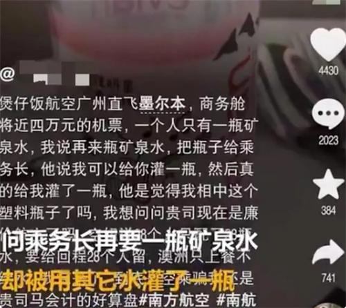 北京時間7月18日,有一位網友發布了一條關于南航的視頻,在這條視頻里面網友表示自己買了一張近4萬元的機票,乘坐飛機時卻只給自己一瓶水。該消息也引起了外界的廣泛熱議,據這名網友在視頻中的講述稱,自己買的是從廣州直接飛往墨爾本的商務艙機票,飛機票的價格接近4萬元左右,但自己在上飛機之后,卻給自己只發了一瓶礦泉水,隨后這名網友想要再向乘務長再要一瓶礦泉水時,陳部長卻拿起空瓶子給灌了一瓶其他的水。對此空姐還向網友解釋表示到,這次航班總共有28個人,為此總共配了28瓶水,到澳大利亞的該航班,只上餐不提供水。