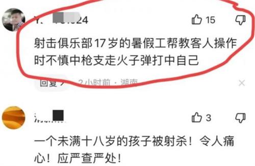 最后這條視頻便引來(lái)了網(wǎng)友們的評(píng)論,有很多種在現(xiàn)場(chǎng)的目擊者紛紛在下方表示這明被鳥(niǎo)槍意外擊中的死者才剛剛17歲。也有網(wǎng)友則表示這名死者在此之前曾經(jīng)在岳陽(yáng)的一家射擊俱樂(lè)部里面工作過(guò)。據(jù)了解這名死者當(dāng)時(shí)正在這家設(shè)計(jì)俱樂(lè)部里面打暑期工,沒(méi)有想到卻發(fā)生了意外情況,被嗆意外擊中之后,死者被緊急送往醫(yī)院搶救,但最終搶救無(wú)效被醫(yī)生宣布身亡。