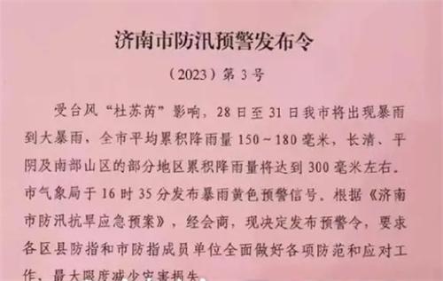 7月28日,濟南受到臺風影響開啟了暴雨模式,導致濟南部分路段已經(jīng)出現(xiàn)了深度積水很多區(qū)域都已經(jīng)開啟了“開船模式”。7月28號根據(jù)九派新聞最新報道,濟南受到臺風“杜蘇芮”的影響,7月28號到7月31號濟南將會出現(xiàn)暴雨天氣或者大暴雨天氣,濟南全市的平均降雨量能夠達到150~180毫米,平陰、南部山區(qū)、常青部分地區(qū)累積降雨量能夠達到300毫米左右,濟南一部分路段已經(jīng)出現(xiàn)了深度積水很多地方都已經(jīng)開啟了“開船模式”。