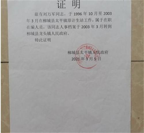 劉萬軍所拍攝的人事檔案登記簿的復(fù)印件上顯示寫有自己姓名的那一欄有一個箭頭延伸出來標(biāo)明轉(zhuǎn)太平鎮(zhèn)政府,登記簿上的簽名是周美群,簽名的時間為2004年12月20日。劉萬軍表示周美群2004年時是柳城縣太平鎮(zhèn)組委,自己在1996年10月到2003年3月時曾經(jīng)在太平鎮(zhèn)計生站工作過,后來被調(diào)到了龍頭鎮(zhèn)環(huán)衛(wèi)站。