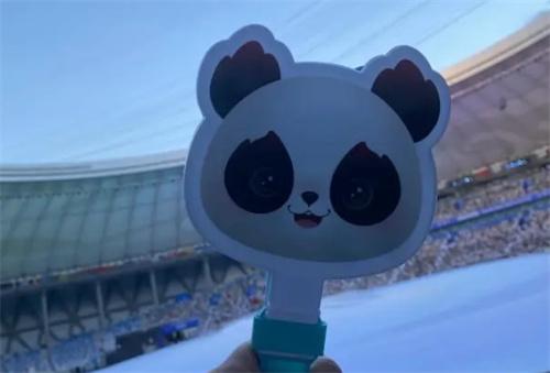 7月28號下午紅星新聞記者來到了成都市東安湖體育公園,遠遠就能夠看到一只熊貓車駛來,這個熊貓樣式的擺渡車上面有著圓圓的熊貓車頭,還有著大大的黑眼圈將觀眾運送到開幕式場館,進入開幕式場館之內每一個觀眾的座位上都放了一個雙肩包和節目單,這兩件物品上都有蓉寶的身影。打開雙肩包首先需要揭開蓉寶微笑臉頰做成的扣子,里面還有印著成都大運會會徽的扇子,還有一個熒光棒上面寫著成都成就夢想,包括一個非常具有特色的鼓掌拍,鼓掌拍的造型采用的是蓉寶的臉頰形象,搖晃鼓掌拍看起來仿佛是蓉寶在為開幕式歡呼加油。