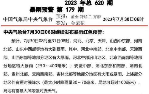 北京時間7月30日,中央氣象局再次發布了紅色暴雨預警信息。預計從7月30號的8點~7月31號的8點。我國北方多個地區將會出現特大暴雨,其中河北、北京、天津、山西等地區有局部特大暴雨,而安徽、湖北、湖南、貴州、云南、吉林等地區有大雨或暴雨,還有個別地區會出現強對流的天氣。對于市民們的出行將會造成非常嚴重的影響,所以氣象局在此也提醒處在這些地區的市民朋友們果沒有必要的事情,盡量不要外出,而且暴雨極有可能會帶來一些地質災害的發生,盡可能的保證自己的生命安全。
