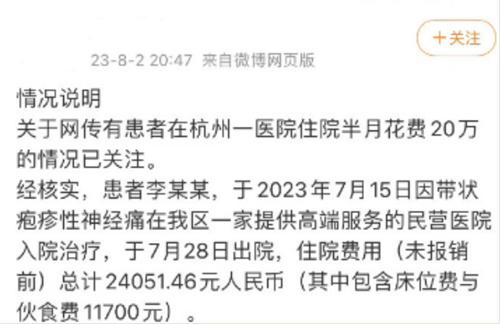 近日網(wǎng)絡(luò)上傳言李立群在杭州看病花費了20萬元,這件事也引起了當?shù)赜嘘P(guān)部門的注意。杭州市蕭山區(qū)衛(wèi)生健康局回應表示,經(jīng)過核實,患者李某某在2023年7月15日因帶狀皰疹性神經(jīng)痛在我區(qū)一家提供高端服務(wù)的民營醫(yī)院入院治療。7月28日出院,住院費用共計24051.46元人民幣。