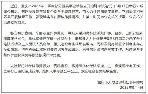 在公安機關將犯罪嫌疑人抓捕歸案之后,重慶人社官方微信公眾號也對事業單位考試作弊的公開通報,并表示目前已經將作弊組織的團伙成員全部抓捕,隨后在官方微信公眾號中又表示豐都縣人力社保局將確定于8月3日。會將考生的筆試具體成績以及進入到面試的人員名單對外進行公布,違紀的考生則會取消他們的考試成績,該條消息發送沒過多長時間,南川區也發現有個別考生出現了作弊的情況。目前南山區的這些考生也正在等待進行調查,一旦調查結果確認也將會取消這些考生的成績之后,將會再展開接下來的招聘工作。