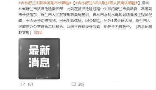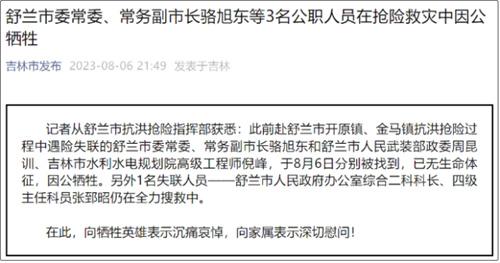 根據舒蘭市抗洪搶險指揮部的工作人員所傳來的消息,這三名公職人員在抗洪搶險的過程中,因為遇到危險而失聯。這三名公職人員被找到之后已經沒有了生命體征,既讓眾人為之感到痛心,同時我們也向這三位無私奉獻的英雄們表示崇高的敬意。