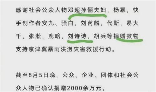 近期,河北涿州由于洪澇的災害受到了外界的廣泛關注。也有很多企業明星紛紛向河北涿州地區進行了貸款,展示了自己對于災區人民的幫助以及關懷之情,然而伴隨著一份捐款名單的出現,也立刻引起了網友們的深入關注。份名單引起觀眾的主要原因主要在于在該款名單中,已婚的劉詩詩在捐款的時候并沒有以夫妻雙方的名義,而是以自己的個人名義去進行捐款,在捐款名單中也并沒有看到她的丈夫吳奇隆的名字,上的這一情況也立刻引發了媒體人的多方猜測,甚至有很多人懷疑兩個人的婚姻關系是不是出現了問題。