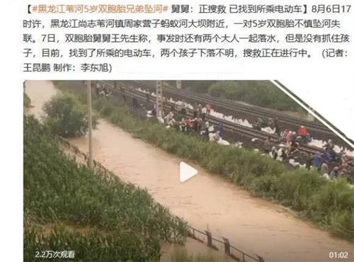 北京時間8月6日晚上5點左右,黑龍江再一次發生了一起雙胞胎墜河失聯事件,對掉落河里失聯的雙胞胎家里居住在黑龍江尚志葦河鎮周家營子螞蟻河大壩附近,雙胞胎失聯消息一經傳出之后,立刻引發了社會群眾的關注。時間來到8月7日時,這對雙胞胎的舅舅王先生接受記者采訪時表示,事情發生時還有兩個,大人跟著兩個孩子一起落水了,但是這兩個大人卻沒能夠將孩子給抓住,截止到目前為止,經過救援人員的搜救,現在已經找到了私發的電動車,然而兩個孩子卻下落不明搜,救工作依舊正在進行中。