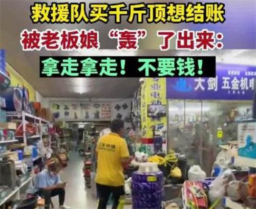 據了解,當時有一支救援隊伍來到河北省淶水縣城市城內,準備購買千斤頂,當這支救援隊的工作人員,挑好千斤頂準備去結賬的時候,店里的老板娘卻直接讓他們拿走去,用不收他們的錢,救援隊的工作人員則不能夠這樣做,必須要給錢。但是店里的老板娘卻直接擺著手,而且語氣萬分堅定的說,你們是來淶水縣幫忙的,不會收你們的錢,快拿走拿走。這一句看似無比簡單的話語卻像一股暖流一樣,溫暖了救援對每個人的內心,相信這些救援隊的救援人員也沒有想到,正是因為自己的善良舉動才得到了如此溫暖的回應。