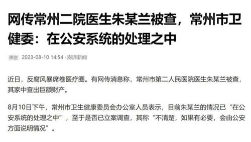 8月10日,有消息傳來稱位于常州市的第二人民醫院醫生朱某蘭已經被紀委監委帶走檢查。朱某蘭在被走檢查這一消息散開之后,也有小道消息立刻傳來稱,從朱某蘭的家里面被查到了1.5億元,其中有4000萬的現金,30斤的黃金,還有20套的房子。這一消息也立刻引發了極大的社會輿論,隨后央視的記者也立刻和該起事件的知情人處取得了聯系。知情人士向記者透露,在半年之前相關部門確實就已經將朱某蘭給進行了留置,朱某蘭被相關部門調查,并不是在這一次的反腐新報中被發現的。除此之外,在提到網上所傳播的金額是知情人士表示這個金額和實際查處的金額有著很大的出入。