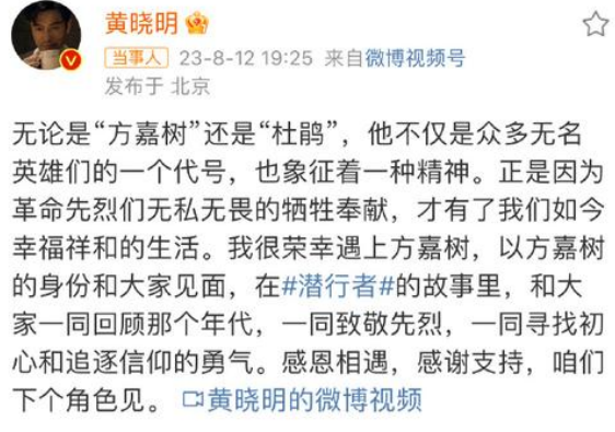近日,我國著名男演員黃曉明在自己的社交媒體上發布了一篇告別信。偏告別信的主要內容是告別自己在前行者這部電視劇中所扮演的角色方嘉樹,黃曉明不僅在信件里面表達了自己對這個角色的感激之情溢于言表。因為方嘉樹的這個角色,也讓他再一次深入的了解到了那些曾經為國家無私奉獻過的英雄們,為此在這封信里面也向這些英雄們表達了崇高的敬意。