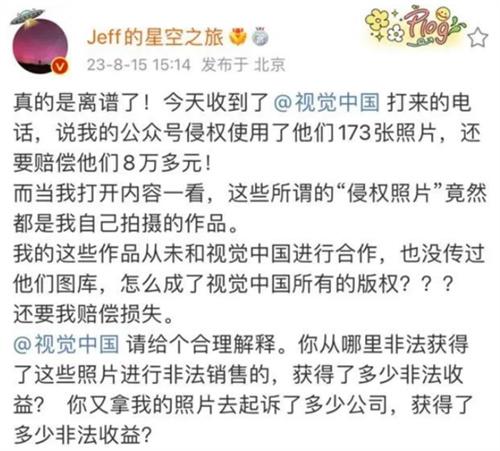 北京時間8月15日,一名叫做戴建峰的網友在自己的社交媒體上發文稱自己在今天接到了一通來自于視覺中國的電話。在這通電話里面視覺公眾號的工作人員表示自己未經視覺中國的同意,私自使用了他們173張照片,需要對他們進行8萬元的補償。戴建峰提到視覺中國所說的侵權照片時,直接表示這些照片全部都是自己所拍攝的作品,為此戴建峰想要視覺中國給自己一個合理的解釋。