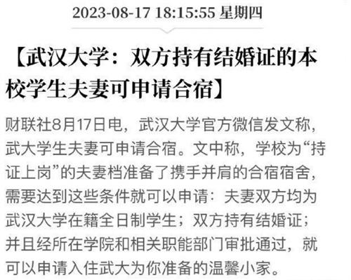 在北京時間的8月17日,武漢大學在自己的官方平臺上對外發文表示,在武漢大學就讀的學生夫妻可以去申請合宿了,為了解決學生夫妻的住宿問題,武漢大學專門為那些持有結婚證的學生夫妻專門準備了合宿宿舍。要夫妻雙方符合申請條件即可向學校進行申請,武漢大學為學生夫妻專門準備了合宿宿舍,這一消息對外發布之后,也受到了外界的深入討論。