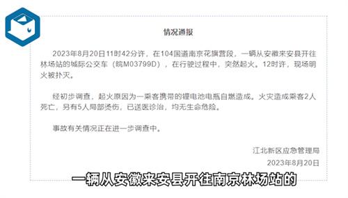 8月20日,南京江北新區微信公眾號發布通報,在104國道南京花旗營路段中,一輛從安徽來安縣開往林場站的城際公交車在行駛的過程中突然起火,火勢很快蔓延開來,一直持續到中午12時左右,現場的明火才被撲滅。事故發生后經過初步調查,此次起火的原因是因為一名乘客攜帶了鋰電池電瓶導致,一名乘客將電瓶放在了自己的背包中,在行駛的時候電瓶突然自燃起火。此次火災造成了兩名乘客死亡,并有五名乘客局部燙傷,目前已經送往醫院救治。