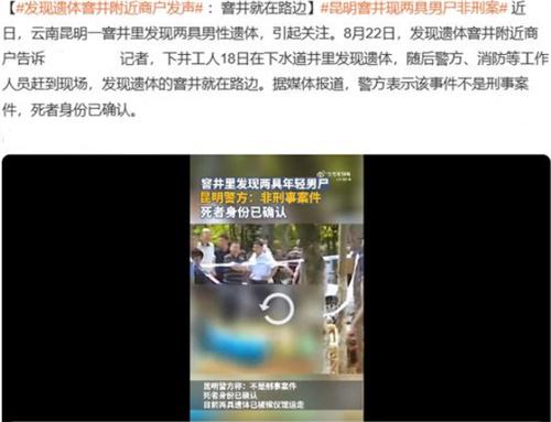 此之前云南昆明當地的媒體對這起案件進行進行過報道,在報道中的消息顯示稱有市民近日在盤龍區金色大道和盤江東路交叉口附近的窨井里無意間發現了兩具男性的尸體,記者在聽聞這一消息之后也立刻來到附近,對這附近的商戶進行采訪,接受采訪的商戶表示,當時有工作人員下井工作,而在下井時看到了這兩具尸體,隨后變快速報了警。