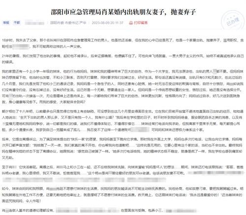 據了解,在北京時間的8月9日,有一名網友登錄了問政湖南的官方平臺,在官方平臺上直接舉報自己在邵陽市應急管理局工作的父親小寶婚內出軌朋友的妻子。這位網友在舉報時表示,早在2021年時家人就發現了肖某出軌的事情,肖某起初根本就不承認自己出軌這一事情,后來再看到我們已經掌握了他出軌的真實證據。得知沒有辦法再繼續隱瞞下去,便大方承認了這件事情,肖某在承認了自己出軌這一事情之后,更是大言不慚的表示全天下出軌的男人多了去,又不是只有自己一個人自己也,究竟犯了什么錯的話語。