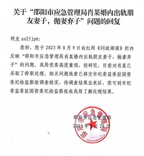 近日,位于湖南省的邵陽市傳來一條消息稱,有一名公職人員被親生兒子實名舉報婚內出軌朋友妻子,這條消息在網上流傳之后,便引來了網友們的激烈討論。北京時間的9月7日,邵陽市應急管理局對于該條消息也給出了正式的回應,應急管理局的工作人員表示,目前對這名叫做肖某的公職人員已經作出了停職的處理的決定,并且已經對肖某進行了立案調查,但目前尚未得出調查結果。