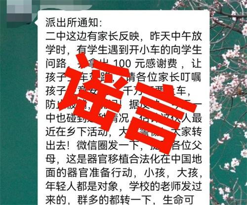 通過民警查實這一消息為不實的謠言,早在2016年這一謠言在全國多地都不斷的傳播多。地的公安機(jī)關(guān)也針對這一消息作出辟謠。打著安全教育的旗號,卻煽動家長不斷轉(zhuǎn)發(fā)到其他群里,在社會和廣大學(xué)生的家長中也造成了眾多不良的影響。
