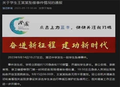 近日,一名海南省澄邁縣澄邁中學的學生跳樓不治身亡。記者從登邁中學學生處了解到信息這起事件發生時間是9月14日,跳樓的學生是該學校高二年級的一名男生。跳樓學生的母親在9月18日向新聞記者表示孩子的身體不舒服,原本的計劃是9月15日帶孩子去醫院看病,但還沒來得及趕到學校請假孩子就已經出事了。這起事件發生之后,記者聯系了學校的領導,核實情況,但沒有得到回復,而澄邁縣宣傳部工作人員對記者表示,這起事件在當地開會討論具體情況要等官方通報。