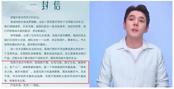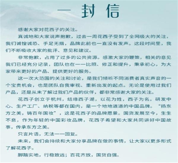 在道歉信當中,花西子品牌方首先是對于李佳琦這個事件進行了回應,花西子承認了這件事情當中品牌方式存在一定的失誤的,并且以后將會采取相關的措施,防止此類事情的再次發生。不過道歉信的后半部分全都是在介紹花西子這個品牌的來源,以及花西子想要達成的目的,似乎在向所有的觀眾展示他們的產品,在消費者當中是非常受歡迎的,這一封道歉信讓許多的網友感到非常的不滿,認為花西子的道歉沒有任何的誠意,一篇文章當中有一半的內容都是在宣揚自己的品牌,似乎在轉移話題。