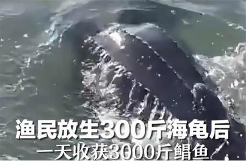 自己兩次都曾經誤捕了大海龜,去年是一只玳瑁,而今年是棱皮龜,這兩次上新聞都是因為龜哥的原因,這次將棱皮龜放生,還得到了實質性的獎勵。在放生的當天一天時間竟然捕捉到了3000金鯧魚,對小船來說這一次捕撈的產量也是十幾年以來最多的一次,認為是放生了龜哥所帶來的好運。