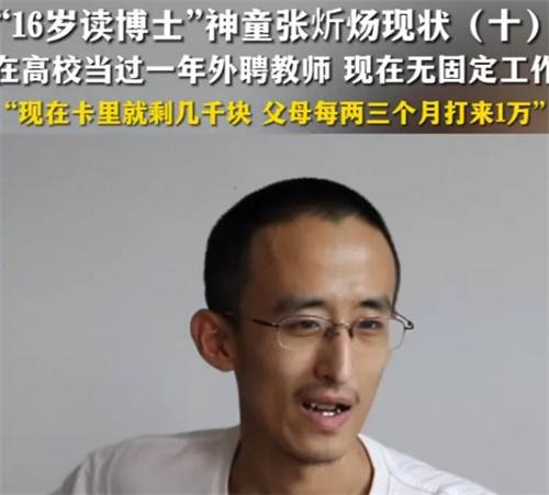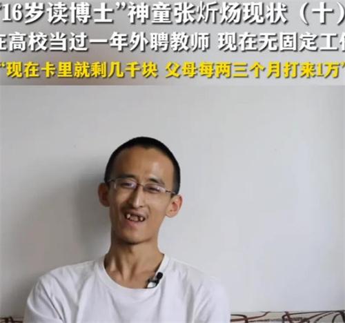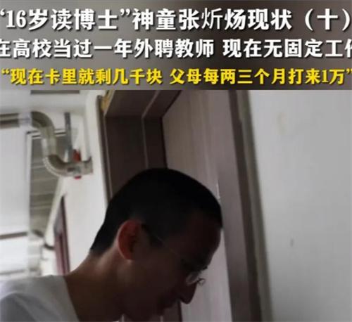 9月20日,當(dāng)年16歲讀博士的神童張炘煬他的現(xiàn)狀被記者曝光。據(jù)了解,張炘煬在成為了博士后,辭去了自己在寧夏師范學(xué)院外聘教師的職業(yè),如今到現(xiàn)在為止,他沒有一個固定的工作。他表示當(dāng)外教一個月的課時費為5000元,學(xué)校再補貼5000元,大概自己攢下了將近5萬塊錢的費用,但是現(xiàn)在已經(jīng)幾乎全部花光了,現(xiàn)在他的父母每三個月會給他1萬塊錢的花銷費用。