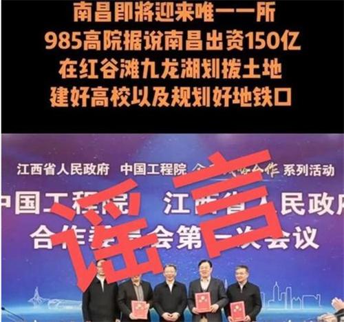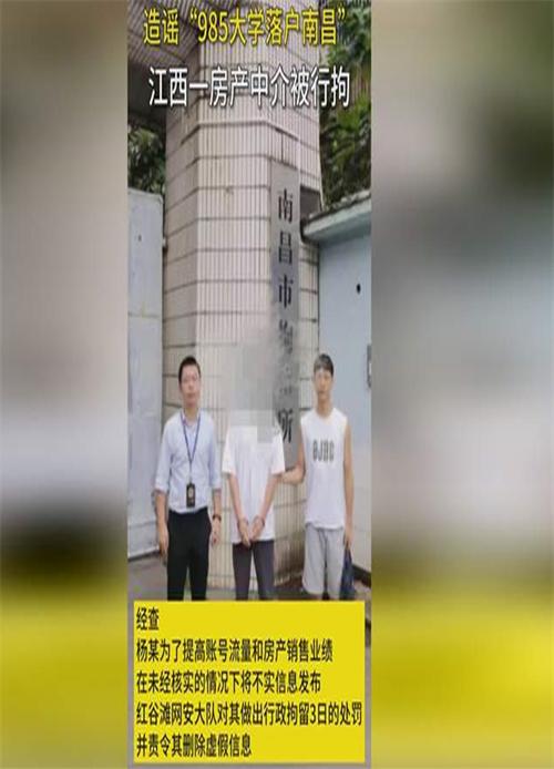之前某網(wǎng)民在網(wǎng)絡(luò)上發(fā)布視頻宣稱一所985大學(xué)將會在南昌落戶,并且稱南昌政府出資人民幣150億,已經(jīng)劃撥好了土地,進行高效的建設(shè),并且已經(jīng)規(guī)劃了地鐵口。此消息已經(jīng)被證實是某房產(chǎn)中介為了博取流量,提升房產(chǎn)銷售的業(yè)績而發(fā)布的虛假信息。江西一名房產(chǎn)中介已因此被捕。
