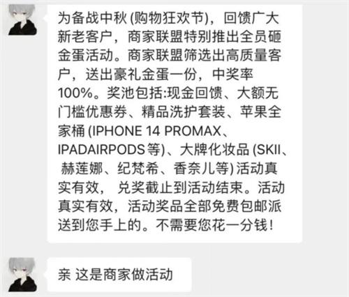 有一位網(wǎng)友在收到免費(fèi)月餅這份快遞之后告訴記者,你打開免費(fèi)月餅的快遞后,發(fā)現(xiàn)在里面還有一張抽獎券,在這張抽獎券里面還有著非常具有誘惑力的大獎,一部iPhone14手機(jī),但是想要抽獎的話,則必須根據(jù)這張抽獎券上顯示的消息去對某公眾號進(jìn)行關(guān)注,隨后添加公眾號的客服才能夠去領(lǐng)取獎勵,網(wǎng)友表示自己將客服的微信加完之后,客服就讓自己將自己的家庭住址以及銀行卡賬號和收款碼全部給對方,同時還告訴自己獎品寄出之后必須讓自己去指定的APP才能夠去進(jìn)行查看,隨后客服又發(fā)來了一個鏈接讓自己下載,但是這位網(wǎng)友在看到這個鏈接之后便直接拒絕了。
