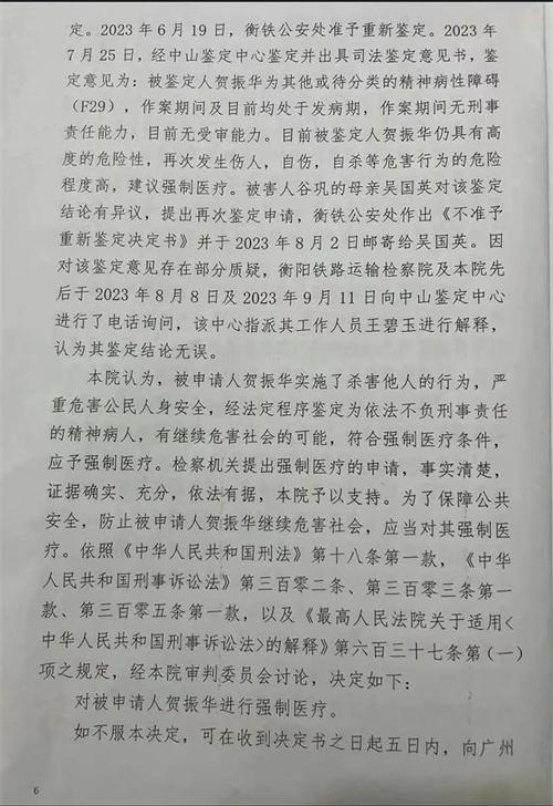 北京時(shí)間10月8日,在火車站持刀行兇致一人死亡的嫌犯賀振華,現(xiàn)在被鑒定患有精神疾病,目前法院決定對該男子進(jìn)行強(qiáng)制性的醫(yī)療。對于這件事情,賀振華的代理律師以及被害人親屬的律師都已經(jīng)證實(shí)了消息的真實(shí)性。這一起命案是發(fā)生在2023年的5月4號,列車k435在行駛湖南衡陽這個路段的過程當(dāng)中,一名乘客谷某被賀某連刺數(shù)刀,最終經(jīng)過搶救無效身亡,而嫌犯賀某也是當(dāng)場被逮捕。