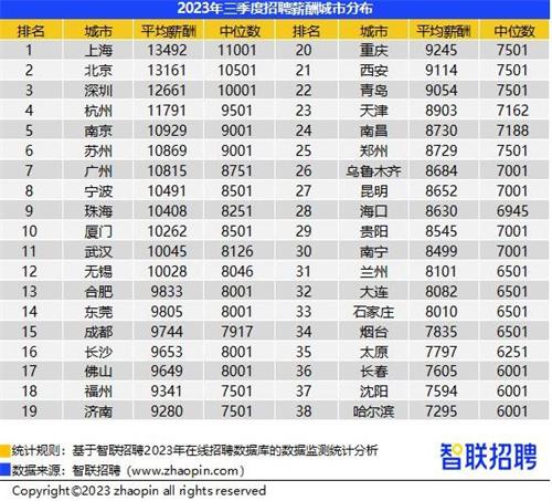 近日,在智聯招聘所發布的2023年《中國企業招聘薪酬報告》中可看,三季度全國平均招聘的薪酬為每10,115元/月,第2季度的10266元/月,相比有小幅度的回落。在38個核心城市當中,上海薪酬排在了首位。