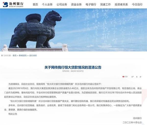 在這一份列表當中寫了恒大集團欠各大銀行有多少貸款,其中關于滄州銀行就有34億元貸款,這件事情很快就在網絡上面發酵,而且熱度也是非常高。滄州銀行只能出面進行解釋,并表示在2023年10月6號之前,滄州銀行只是向恒大集團和關聯的一些企業進行過借款。這款金額達到了3.46億元,而且這款是有抵押物品的,所以風險性非常低,并不會對銀行造成非常嚴重的損失,不過目前恒大集團已經倒閉,滄州銀行已經向法院提起訴訟,準備把借給恒大集團的貸款給全部要回來,目前這個案件已經勝訴。