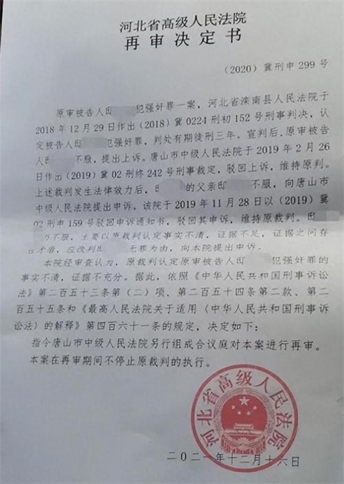 2018年6月1日灤南縣檢察院以強奸罪對小邸起起公訴,但小邸在法庭上并不認罪,最終判處了3年有期徒刑,最終在不斷的申訴后,2023年10月10日,最終以事實不清,證據不足,將原判撤銷改判無罪。