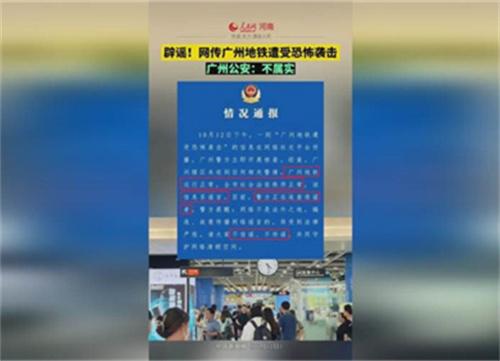 一則廣州地鐵遭受恐怖襲擊的信息于10月12日在網絡平臺上迅速傳播,廣州公交公安官方微博于當天下午就此事發布情況通。廣州警方就此事立即展開核查,經調查網絡所傳信息系謠傳并不屬實。廣州轄區內至今為止并沒有收到任何有關的警情,廣州地鐵正常運行,廣州全市的治安秩序一切正常。