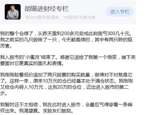 胡錫進(jìn)在自己的個(gè)人賬號(hào)上發(fā)布了自己的虧損情況之后,隨后又表示自己雖然不知道市場的信息到底需要如何才能得到刺激,但是自己依舊始終相信股票市場的整體表現(xiàn)和實(shí)際情況并不會(huì)有過遠(yuǎn)的偏差。雖然我現(xiàn)在的虧損已經(jīng)高達(dá)了6%,但是自己在股市上依舊不會(huì)選擇逃走,自己會(huì)在股市上進(jìn)行等待,等待股市恢復(fù)的到來。