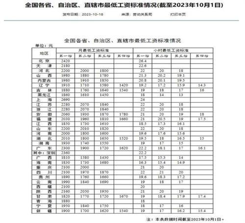 北京時間10月19日,人力資源和社會保障部發(fā)布了全國各個省份的最低工資標(biāo)準(zhǔn)情況,目前我們國家總共有16個省份所有打工人的最低工資標(biāo)準(zhǔn)都是在2000元及以上。近期山東省也發(fā)布了山東地區(qū)最低的工資標(biāo)準(zhǔn),現(xiàn)在對于全國的最低工資標(biāo)準(zhǔn)進行了調(diào)整,山東省每月的最低工資標(biāo)準(zhǔn)為2200元,2010元以及1820元,而北京省從今年的9月份開始將最低的工資標(biāo)準(zhǔn)從2320元調(diào)整到了2420元。