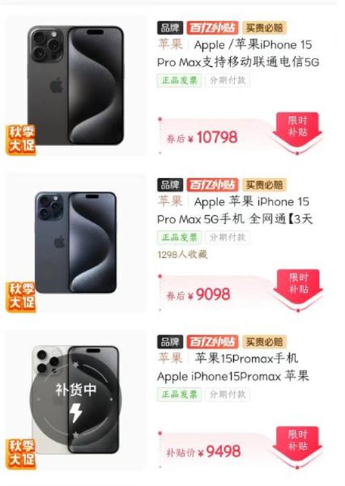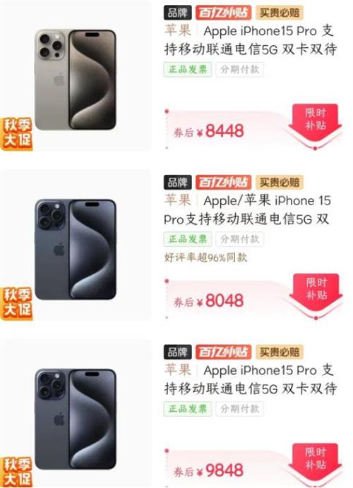 當前,在某電商平臺上面iPhone 15 128G現在的價格為5198元,256G為6098元,如果感興趣的用戶的話,是可以去直接進行購買,官方的價格是5999元和6999元,可以說這一次幾乎所有機型價格都是直接下降了將近1000元左右的優惠。iPhone 15 Plus 128G版本價格為6148元,256G版本為7048元,而官網的價格為6999元和7999元。iPhone 15 Pro 128G版本價格為7498元,256G版本為8048元,而官方給出的價格是7999元和8999元。而iPhone 15 Pro Max 256G的版本價格為9098元,512G版本價格為10798元,官方的指導價格為9999元和11999元,可以說這一次iPhone手機的降價是非常高的,而且存貨是比較足,所以用戶們可以去購買。