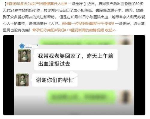 北京時間10月23日,在河南省唐河縣發生了一起令人十分感到惋惜的事情,一位24歲的年輕產婦在產后出血陷入了昏迷,前為止已經昏迷了50多天,最后再將她轉入到鄭州醫院以后不幸離世。這件事情引發了網友們的關注和討論,如此一位年輕的媽媽竟然離開了人世間,盡管醫生們已經使勁了渾身解數,但依舊是沒有能夠挽回他的生命。