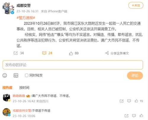 近日,網(wǎng)絡(luò)中流傳成都發(fā)生了一起槍擊案,但是經(jīng)過(guò)公安機(jī)關(guān)的調(diào)查“槍擊案”、“爆頭”信息都是不實(shí)謠言。經(jīng)過(guò)證實(shí),成都確實(shí)是發(fā)生了一起事故,但是是在26日上午8點(diǎn)左右的錦江區(qū)東大路附近發(fā)生的交通事故,有一人死亡,相關(guān)人員已經(jīng)被控制住,機(jī)關(guān)也在依法展開(kāi)調(diào)查工作。我們要對(duì)已經(jīng)證實(shí)的信息保持警惕心理并且不信謠不傳謠,對(duì)于任何擾亂公共秩序的行為公安機(jī)關(guān)都會(huì)依法嚴(yán)厲查處。