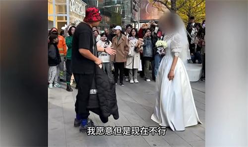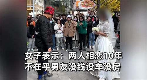 10月29日,一位女生穿著婚紗在繁華的街道上面向一名男子求婚,引發(fā)了網(wǎng)友們的關(guān)注和社會的討論。從現(xiàn)場流出的視頻可以看得出,這名女子穿著一身十分潔白無瑕的婚紗,而且他是非常真誠的向自己的男友進(jìn)行求婚。她也表示自己和她男朋友已經(jīng)認(rèn)識了十年,她也并不在乎自己男朋友有沒有車,有沒有房,有沒有錢,她只是在意自己的男朋友愿不愿意和他共度余生。