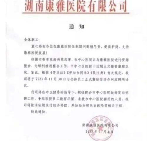11月1日晚間,湖南益陽康雅醫(yī)院發(fā)出與全體員工解除合同的通知。益陽市委建委相關負責人在11月2日表示,這起事件正在處理當中,當前正與醫(yī)院員工進行協商。湖南益陽雅康醫(yī)院在一日晚間發(fā)布的通知,在通知中顯示益陽市中心醫(yī)院近期會正式接管雅康醫(yī)院,決定在本月30日與全體員工正式解除勞動合同或者聘用協議。雅康醫(yī)院也會積極配合市中心醫(yī)院做好定向招聘工作,并且爭取醫(yī)院員工能流進流的工作內容。