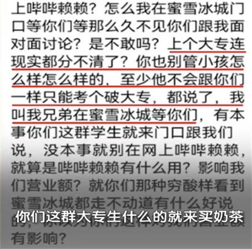 北京時(shí)間11月4日,在廣東機(jī)電職業(yè)技術(shù)學(xué)院的一名學(xué)生發(fā)文吐槽,被學(xué)校內(nèi)蜜雪冰城店鋪老板的孩子進(jìn)行了騷擾。這名學(xué)生表示老板的兒子滿口臟話,不講衛(wèi)生,還喜歡掀女孩子的裙子,與此同時(shí),在社交平臺(tái)上面流傳著一則疑似商家的回懟,他表示別管小孩子究竟怎么樣,至少不會(huì)跟他們一樣考一個(gè)破大專,認(rèn)為這些學(xué)生們看見蜜雪冰城都根本走不動(dòng)道,諷刺學(xué)生們是個(gè)窮酸鬼。