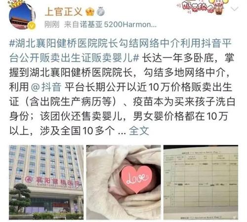 上官正義在11月6日發文舉報湖北襄陽劍橋醫院涉嫌販賣嬰兒出生證明,經過記者一年多暗訪調查之后,發現襄陽劍橋醫院院長葉某某勾結中介團伙利用社交平臺辦理出生證明等信息,尋找客戶,并且販賣疫苗本等等聲稱,只要買證者提供身份信息繳納9.6元醫院會根據生產流程辦理相關手續,生產兩天后出院客戶就可以帶著自己的孩子在該醫院采集新生兒足底血辦理出生證明,最長只需要7天就可以完成,而院長會從9.6萬元中抽取6.6萬元的費用。