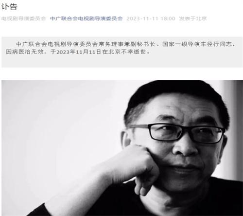 北京時間的11月11日,一條由中廣聯合會電視導演委員會所發布的訃告引發了社會各界的多方關注。中廣聯合會電視導演委員會在這條消息里面稱我國一級導演車徑行去世,因為病情無法醫治,最終車徑行導演在北京不幸離世。
